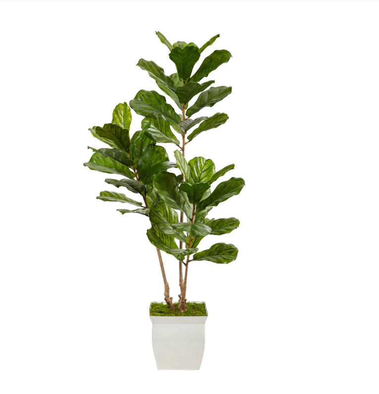 Are you into the tropical look? If yes, this artificial Fiddle Leaf Fig plant will transport you to the African jungle. Three different sized stems rise from faux moss ì showcasing large, glossy Fiddle Leaf leaves that look incredibly lifelike. Trick all your friends into thinking that you can grow a Fiddle Leaf Fig in any indoor / outdoor area; UV resistant for an extra layer of protection. Standing 5.5' from a white planter (included in height), curate in tight spaces. Perfect for an apartment, bathroom, foyer, awkward corner, or bedroom.