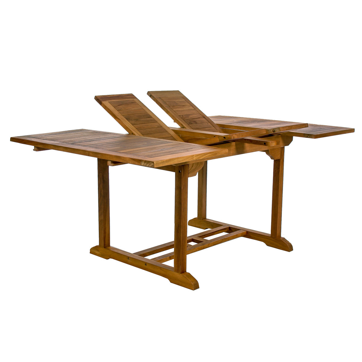 Stylish and solid, our Butterfly Extension Table is hand crafted from Indonesian Teak, with a java colored finish, and fitted with solid brass hardware. Solid mortise and tenon joinery coupled with highly skilled wood-steaming creates solid, snug fitting parts. The 1-7/8 inch umbrella hole is fitted with a brass grommet and cap. The lower pole catch increases umbrella pole stability. Dual Built In Hide-Away Butterfly Extension Leaf-fts allow you to set the table length to 50, 68 or 75 inches. Natural oils and rubbers in Teak provide superior weather and insect resistance compared to other woods., Dual Built-in Butterfly Leaf Design Allows Table to be Set to 3-Different Lengths, Natural oils and rubbers in Teak provide superior weather and insect resistance, 50w x 50d x 29h (expandable to 62-1/2-in or 75-in)